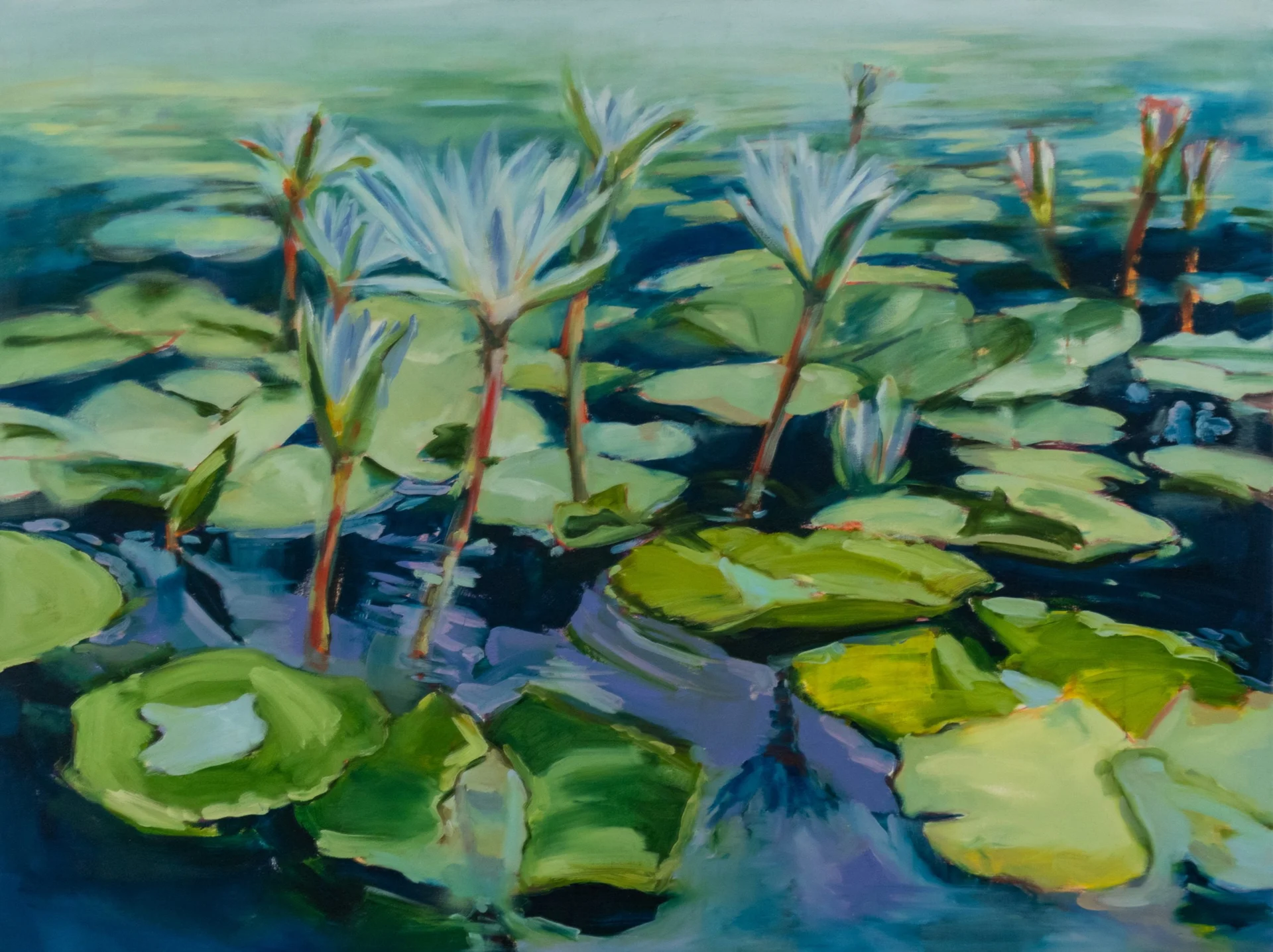 A homage to Monet’s numerous paintings of waterlilies; a fusion of elements of impressionism and abstraction, creating a new world of waterlilies.