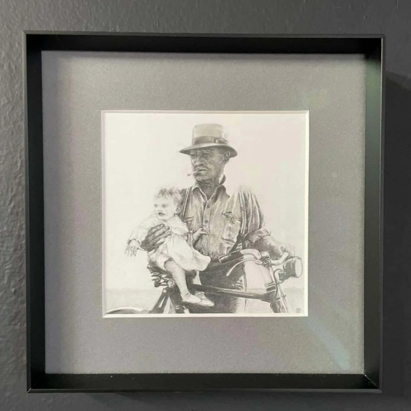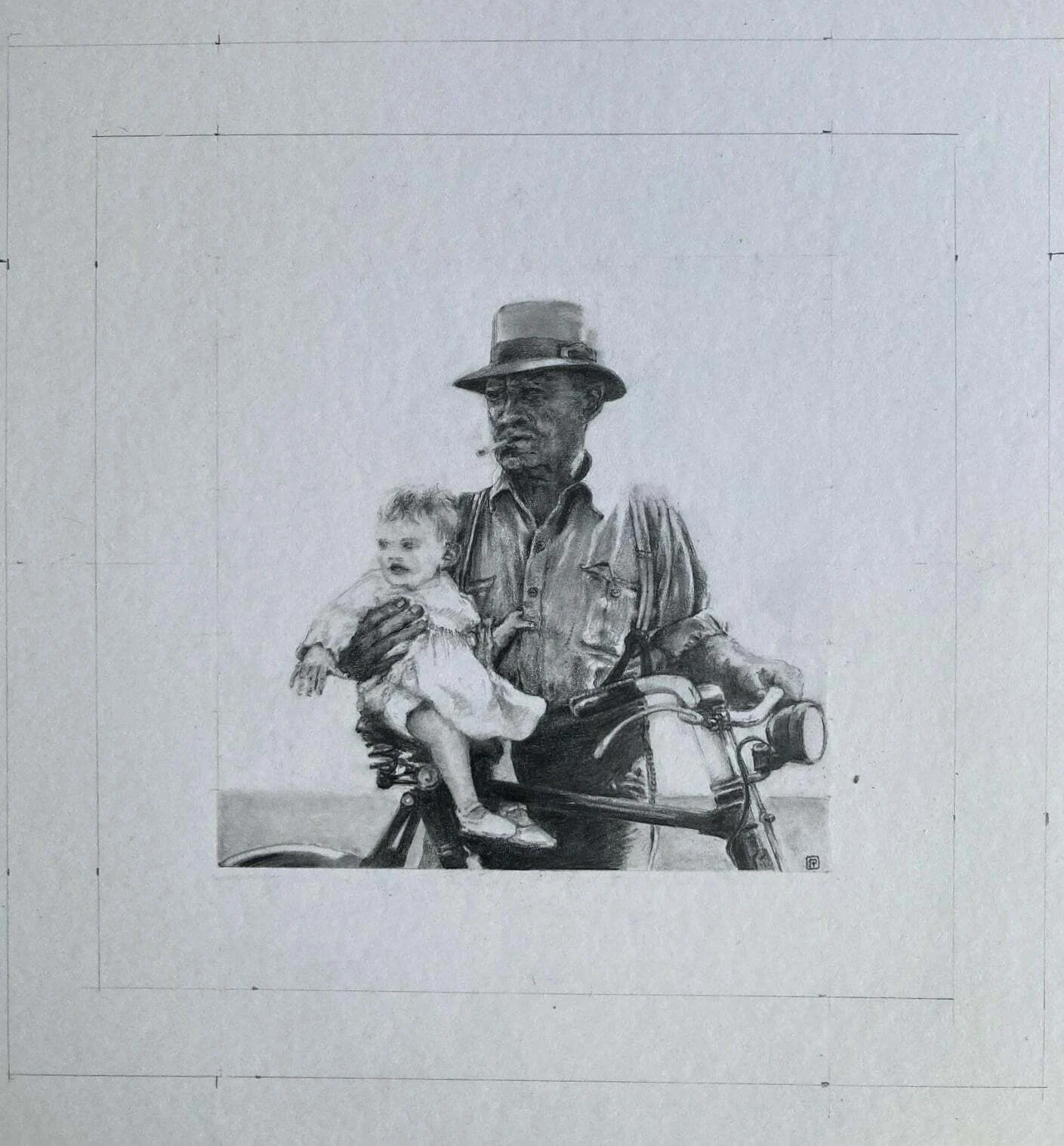 The reference photo was given to me by my late mom.  The man is my grandfather who passed away when my mother was one month pregnant with me.  The young baby he is holding on the saddle of the bicycle is my sister; we share the same birth date 6 years apart.  She tragically died in a car accident a couple of days before her 19th birthday.
